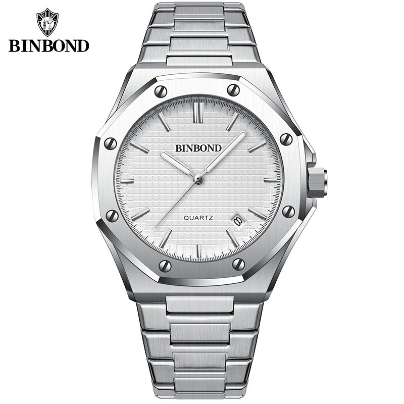 BINBOND Mens Watch Top Brand Royal Casual Men Big Dial Silver Stainless Steel Calendar Quartz Wristwatch Classic Luminous B0233